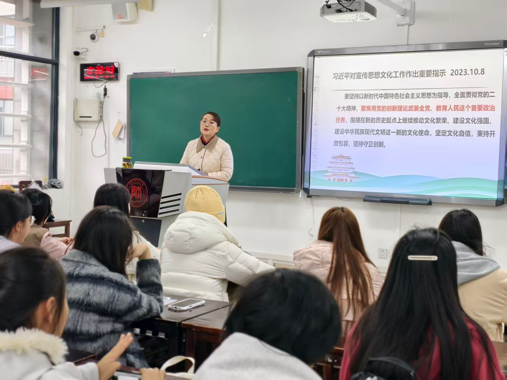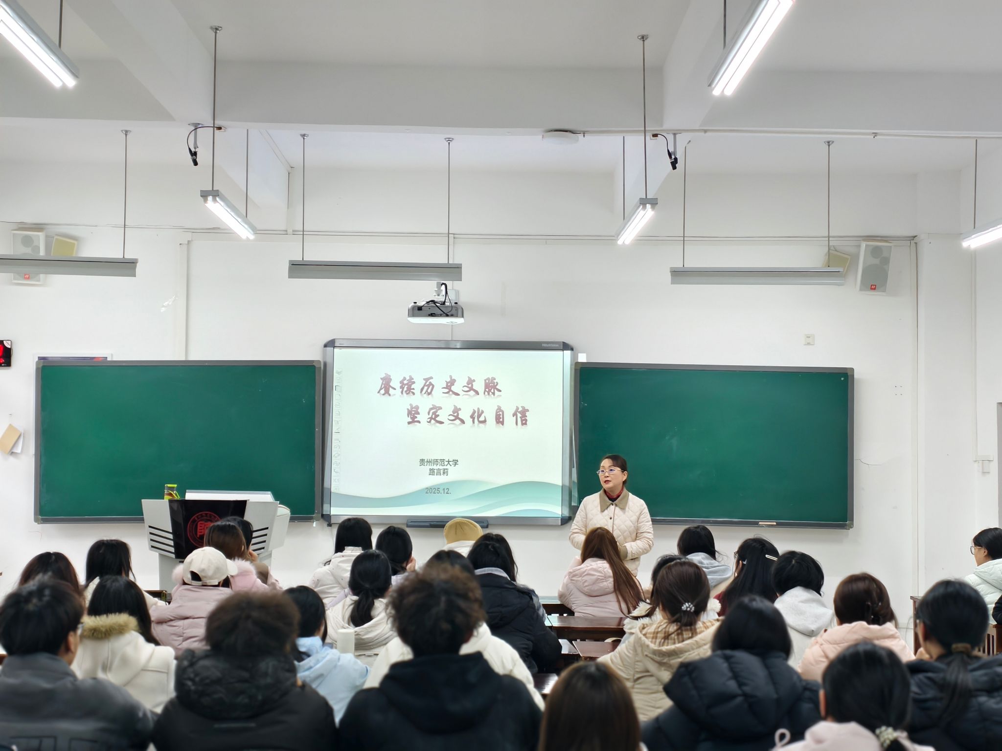 12月10日,2026年世界杯官网党委副书记路言莉在GJ2207教室,为2025级科学教育、科学教育(优师)班的同学们带来了一堂主题鲜明、内容丰富的《形势与政策》课。本次课程以“赓续历史文脉,坚定文化自信”为题,围绕“历史悠久缔造中华文化”“培根铸魂推动文化繁荣”“坚定文化自信 建设文化强国”三个层次展开系统阐述,引导青年学子深刻认识中华文化的博大精深与时代价值,自觉担当起推动文化繁荣、建设文化强国的历史使命。
