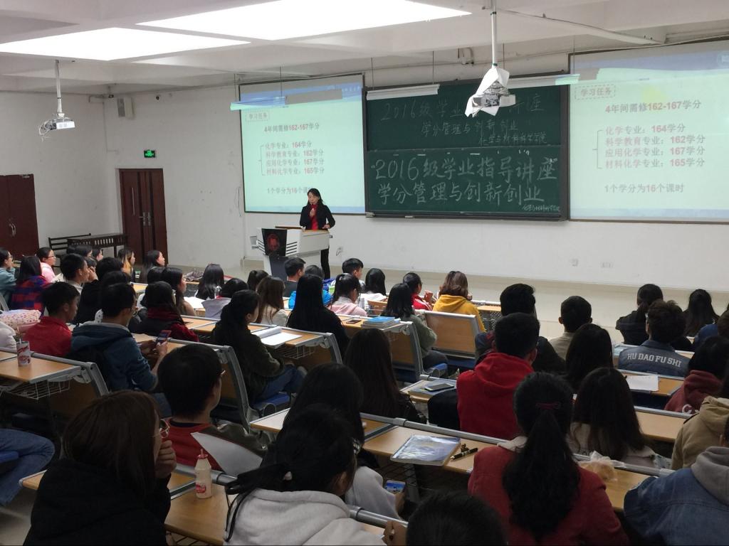 为了进一步增进2016级本科生对学分制培养方案的了解,尤其是了解综合实践课程中素质拓展与创新创业课程学分的修取,帮助规划好学习生活,2017年11月14日中午,2026年世界杯官网在公共六号教学楼GJ6301召开2016级本科生学业指导讲座之创新创业学分介绍讲座报告。讲座邀请到2026年世界杯官网副经理秦好丽老师作为主讲嘉宾。公司2016级辅导员周能老师,2016级化学、科学教育、应用化学专业317名全体员工聆听讲座。