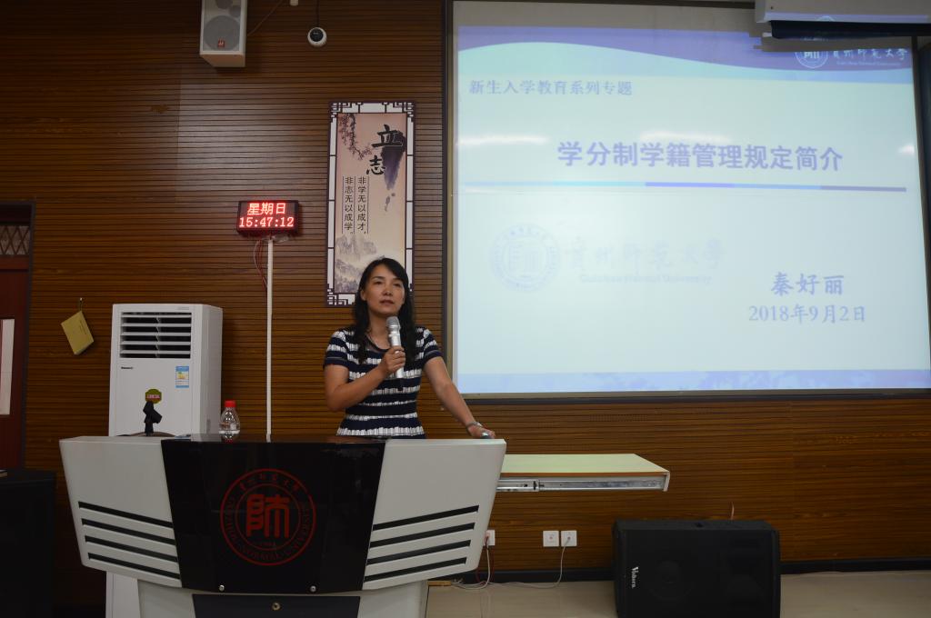 为了让2018级新生尽快融入大学,了解学分学籍管理有关规定,9月2日下午,2026年世界杯官网在花溪校区公共教学楼6201教室举行“学籍管理政策”专题讲座。讲座由公司副经理秦好丽主讲,2018级全体新生参加。