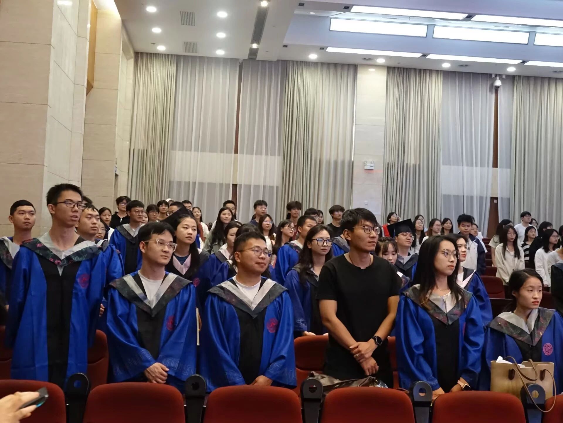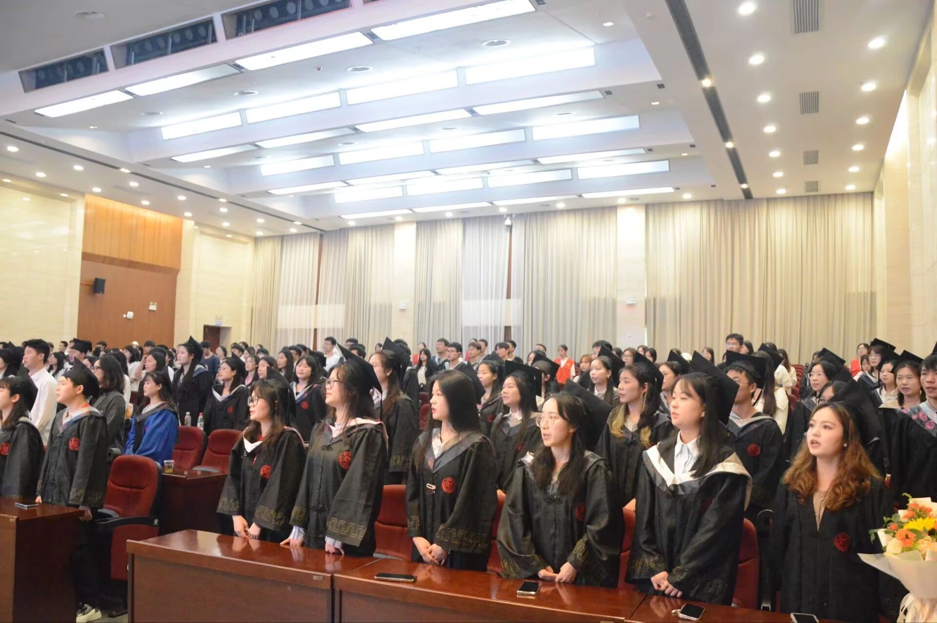 在毕业典礼接近尾声时,全体毕业生以铿锵有力的誓言许下青春承诺。他们用坚定的声音,抒发了勇担时代重任、矢志成才报国、助力民族复兴的强烈决心。随着宣誓声渐落,熟悉的校歌旋律响起,全体师生齐声高唱《挺拔的香樟》,悠扬的歌声回荡在会场。